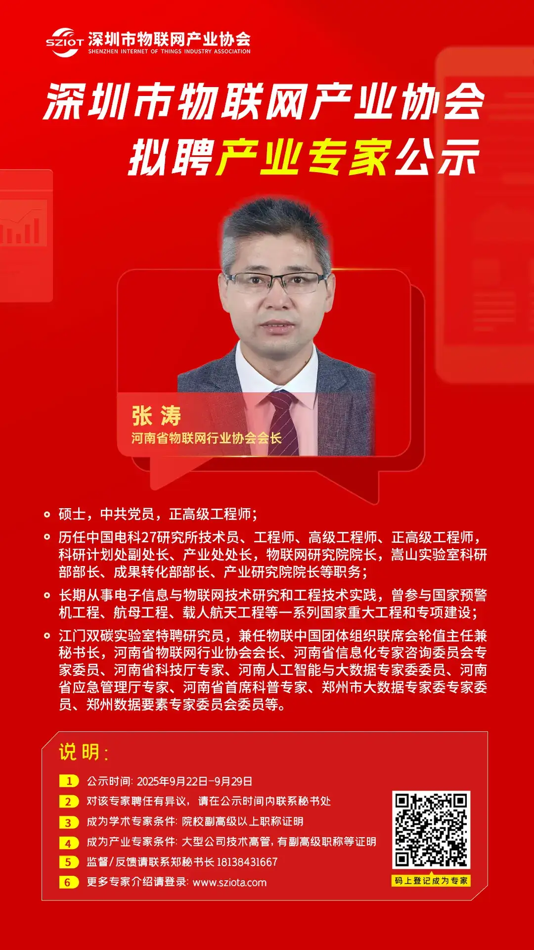 11、【专家公示】关于聘请张涛先生为深圳市物联网产业协会产业专家的公示