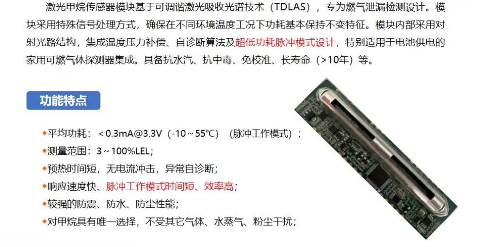 从性能层面来看,该产品从根源上解决了传统传感器的核心痛点:对甲烷具有唯一选择性,不受水蒸气、粉尘及其他可燃气体干扰,误报率趋近于零;采用脉冲工作模式,平均功耗仅<0.3mA@3.3V,支持电池供电长达10年,有效解决了“频繁换电”的运维难题;集成温度压力补偿、自诊断算法,免校准、免维护,大幅降低应用门槛;响应速度≤1秒,在燃气泄漏检测等场景中,为应急处置争取宝贵时间。