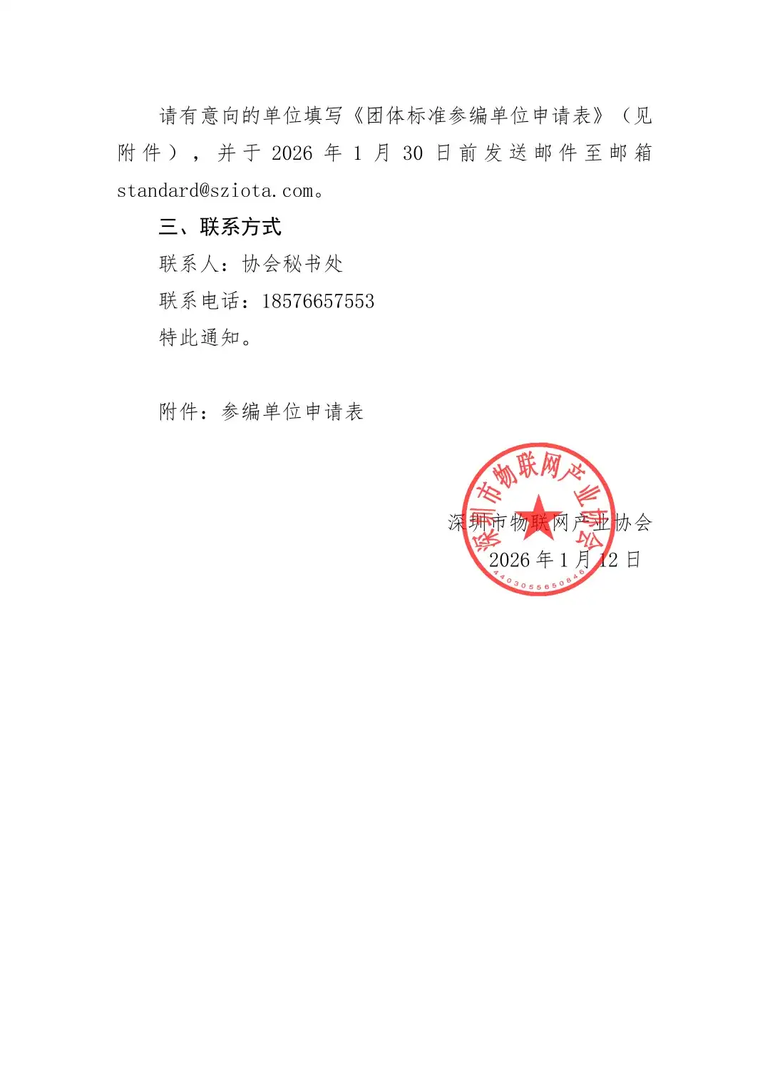 请有意向的单位填写《团体标准参编单位申请表》(见附件),并于2026年1月30日前发送邮件至邮箱standard@sziota.com。