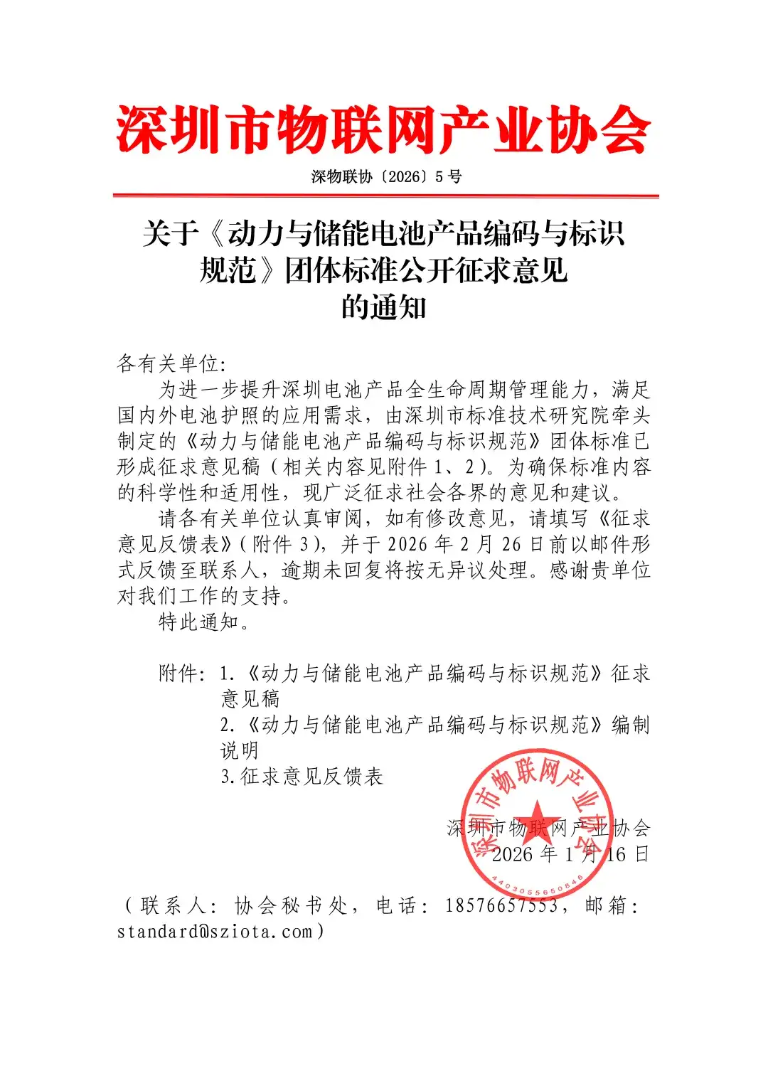 请各有关单位认真审阅,如有修改意见,请填写《征求意见反馈表》(附件3),并于2026年2月26日前以邮件形式反馈至联系人,逾期未回复将按无异议处理。感谢贵单位对我们工作的支持。