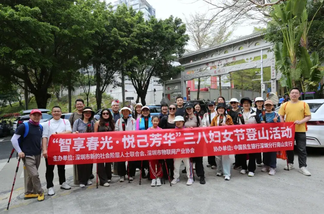 阳春三月,春风送暖。为庆祝第116个“三八”国际劳动妇女节,搭建会员之间的沟通交流平台,增强协会凝聚力,2026年3月7日,深圳市物联网产业协会联合深圳市新的社会阶层人士联合会共同举办“智享春光·悦己芳华”三八妇女节登山活动。来自物联网产业、新阶层人士的女性代表与党员代表,共40余人参加活动,以攀登致敬时代,以行走联结生态,在山海之间展现科技女性自立自强、向上向善的精神风采。本次活动得到中国民生银行股份有限公司南山支行的大力支持。