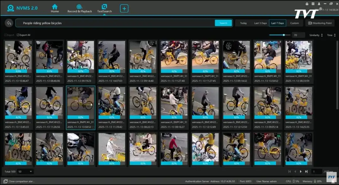 当用户在搜索框输入如“People riding yellow bicycles”这样的描述时,系统不再简单地匹配标签,而是通过深度学习模型,将这句自然语言实时转化为具备深度语义的特征向量。同时,搜索结果可按照相似度、时间等维度自定义排序;并可快速查看搜索抓图和对应视频,大幅提升视频监控检索效率。