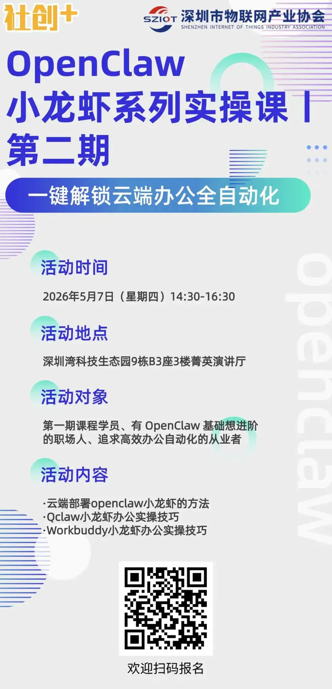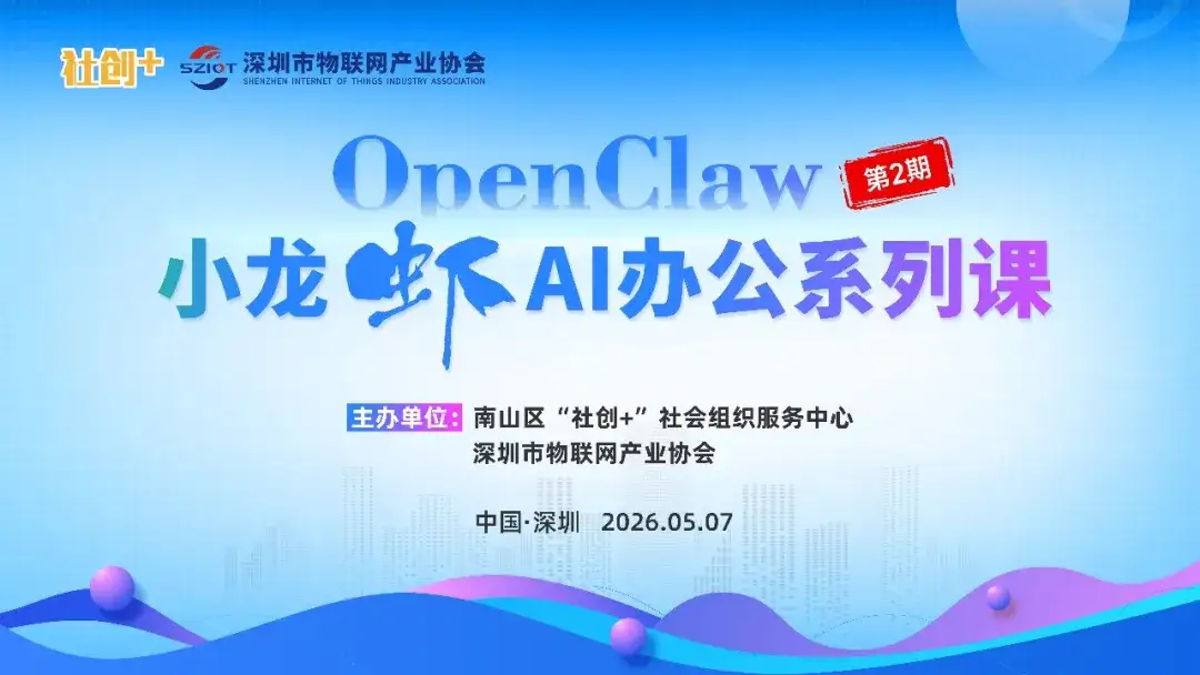 由南山区“社创+”社会组织服务中心联合深圳市物联网产业协会主办的第二期OpenClaw小龙虾进阶实操课重磅来袭!本次进阶课在首期实操课基础上全新升级,从本地部署迈向云端协同,解锁多工具联动新技能!